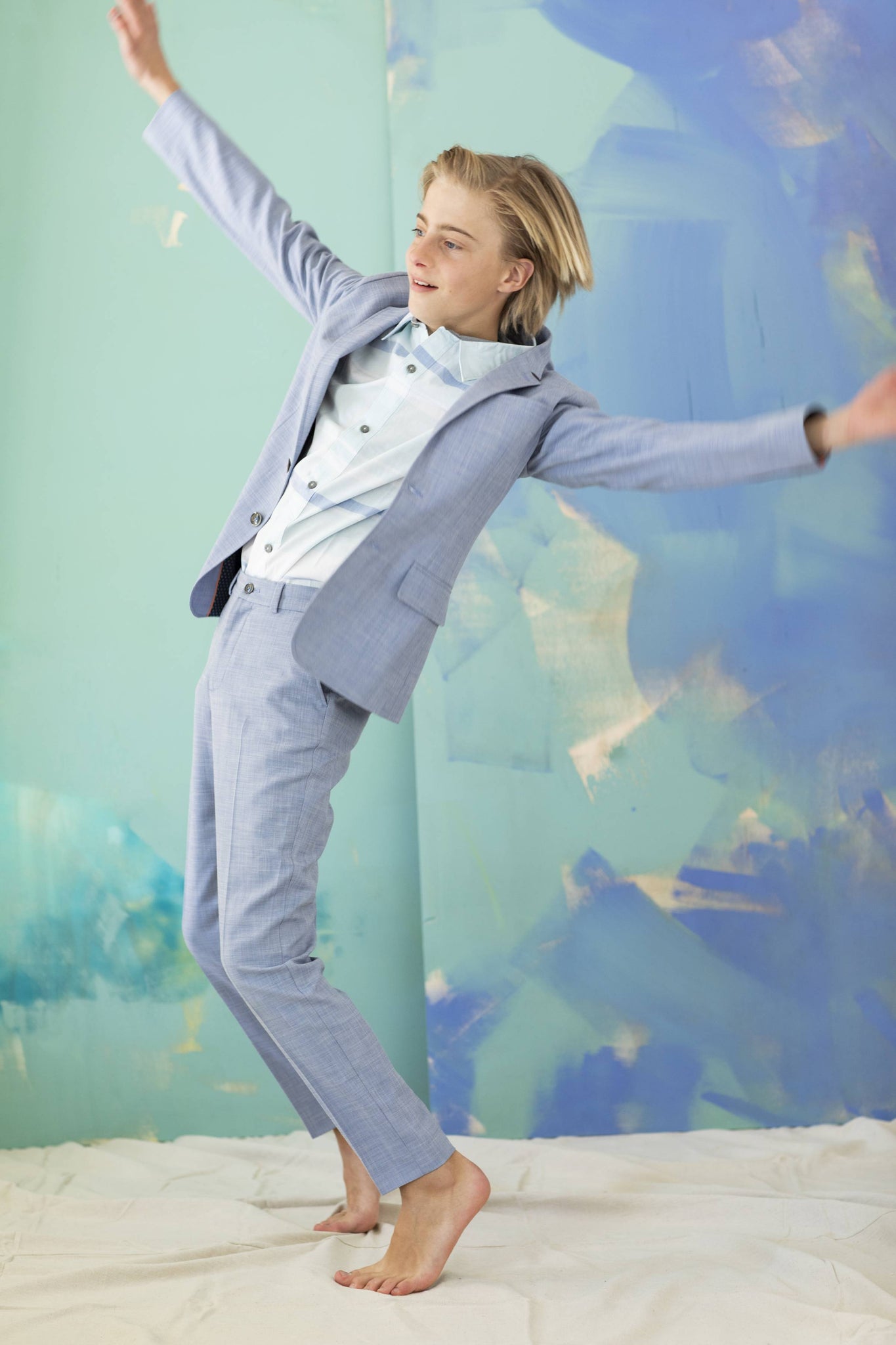 The vibrant sky blue with contrast under the collar, and cuff details of orange, gives a new twist on an old staple. The extra length in the hem, and adjustable inner waist, let the pants grow with a boys ever-growing legs. Wear for a family picture or skating a half-pipe! We can’t wait to see what where your Kindhuman suit takes you!